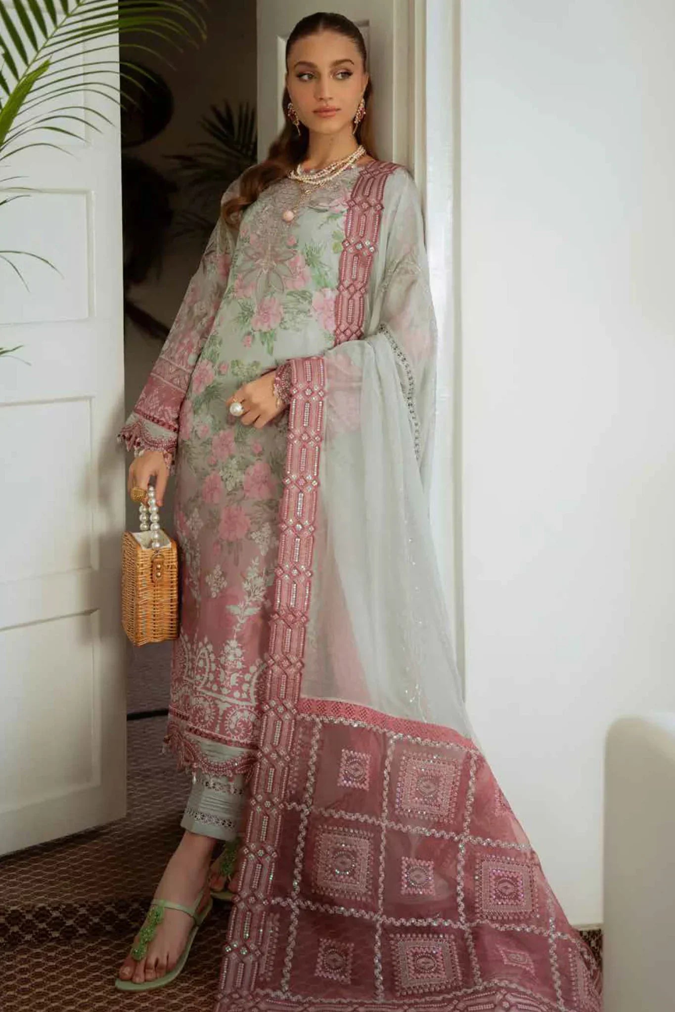 EMBROIDERED AND PRINTED SWISS LAWN SHIRT EMBROIDERED CHIFFON DUPATTA DYED COTTON TROUSER